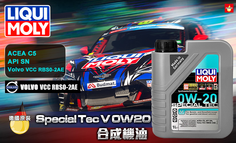 LIQUI MOLY Special Tec V 0W-20 全合成機油,專為符合 Volvo 原廠 VCC RBS0-2AE 認證需求之車款所設計,符合 ACEA C5 與 API SN 規範。採用非傳統高品質基礎油結合現代化添加劑技術,有效降低引擎內部摩擦,發揮最佳化引擎性能表現,同時提升燃油經濟性並減少污染物排放。產品經渦輪增壓器與觸媒轉換器相容性測試,確保長時間使用的安