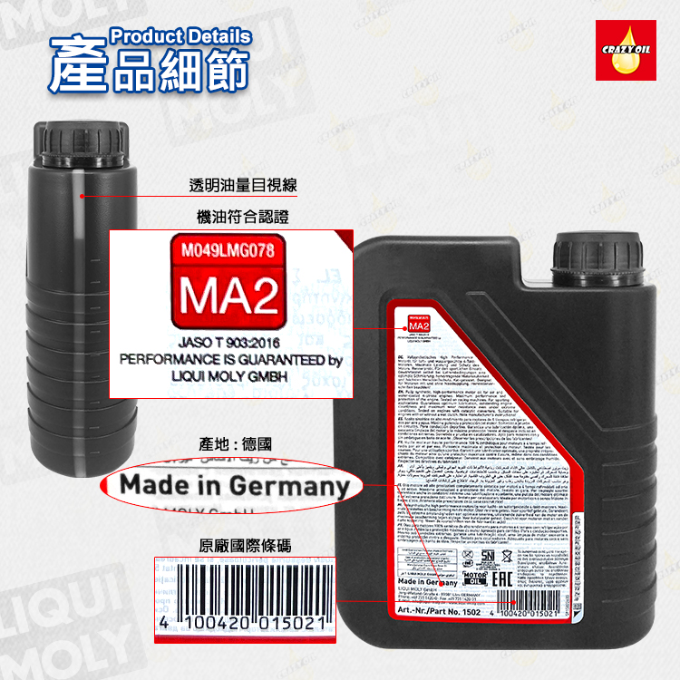 在德國當地市場,LIQUI MOLY 擁有約 30% 潤滑油市佔率與全國第一的添加劑銷量,每年銷出超過 700 萬瓶。多次獲得德國汽車雜誌《AUTO MOTOR UND SPORT》與《AUTO ZEITUNG》最佳品牌獎,是德國消費者心中最具信賴的機油品牌。