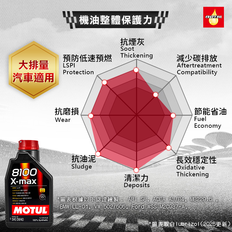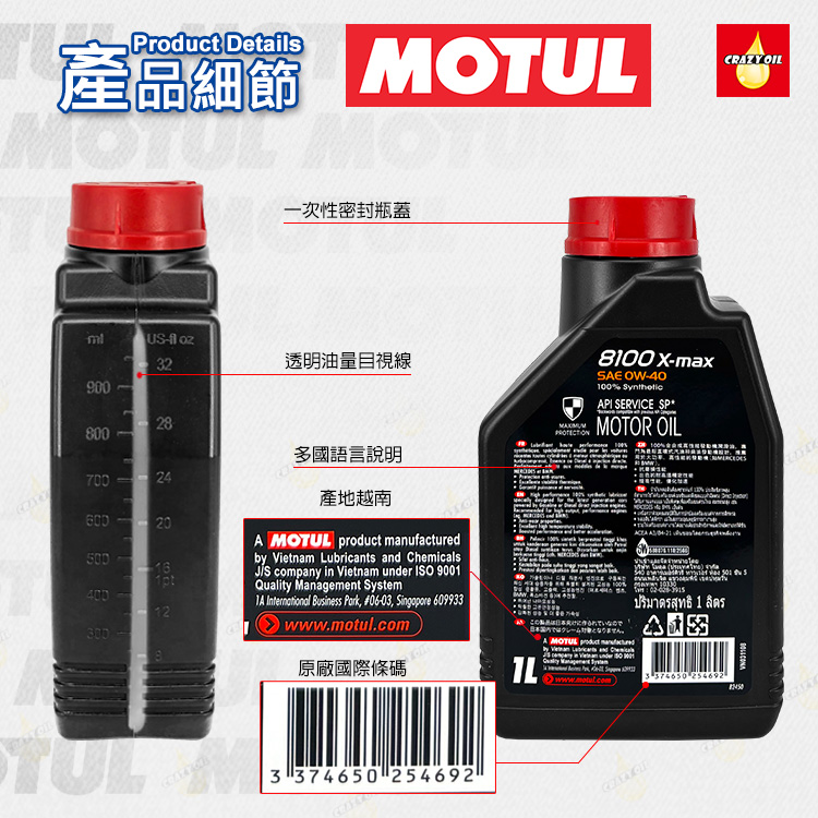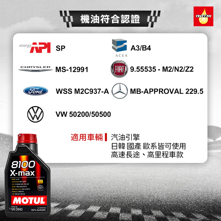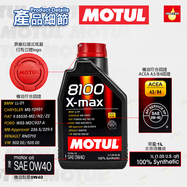 ➤ Motul 8100 X-max 0W-40 是一款全合成高性能機油,專為大排氣量、渦輪增壓和自然進氣汽油引擎設計,具有優異的高溫穩定性和抗磨損保護能力。