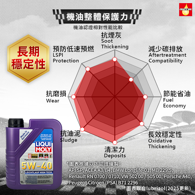 LIQUI MOLY 潤滑油產品符合眾多國際車廠的原廠標準,包括 Mercedes-Benz、BMW、Volkswagen、Audi、Porsche 等。公司通過 ISO 9001、IATF 16949 與 OHSAS 18001 認證,製程嚴謹,並通過德國 TÜV 品質驗證,展現對品質、安全與環保的重視。