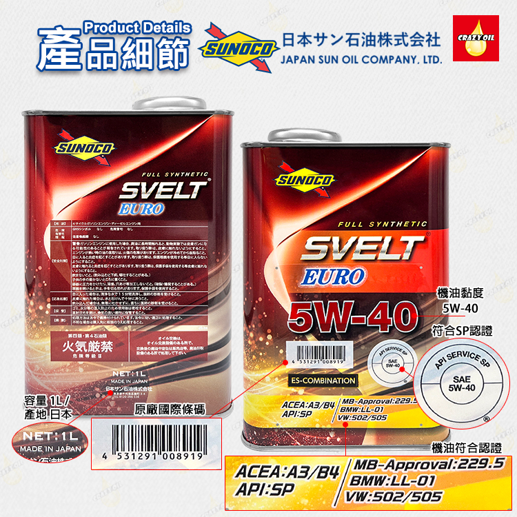 品名 : SUNOCO SVELT EURO 5W40 酯類全合成機油