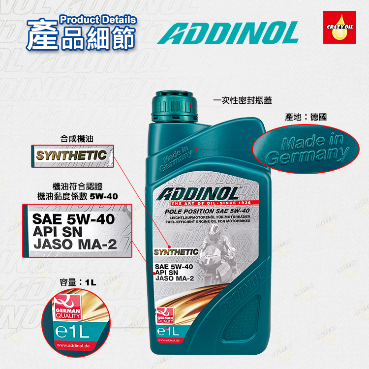 品名 : ADDINOL POLE POSITION 4T 5W40 合成機油
