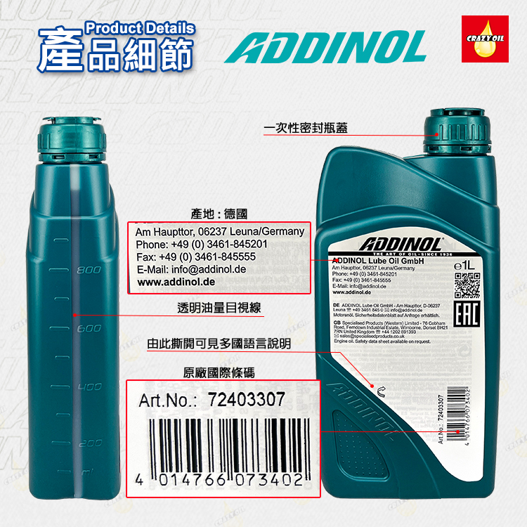 自 1936 年創立於德國以來,ADDINOL Lube Oil GmbH 一直致力於開發和製造創新的高性能潤滑劑,廣泛應用於 汽車、工業與高端機械設備領域。品牌名稱源自 "Additives In Oil" 的縮寫,強調其核心技術——透過添加劑科技,釋放機油真正潛能。