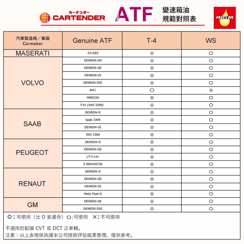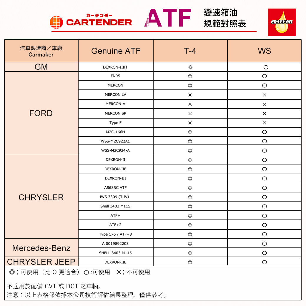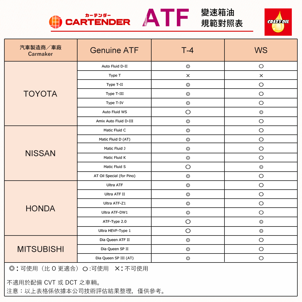 品名 : 日本 CARTENDER ATF CT-WS 全合成變速箱油