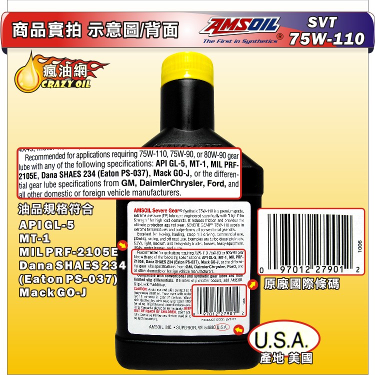 品名 : AMSOIL安索 頂級長效SVT - 75W110 齒輪油