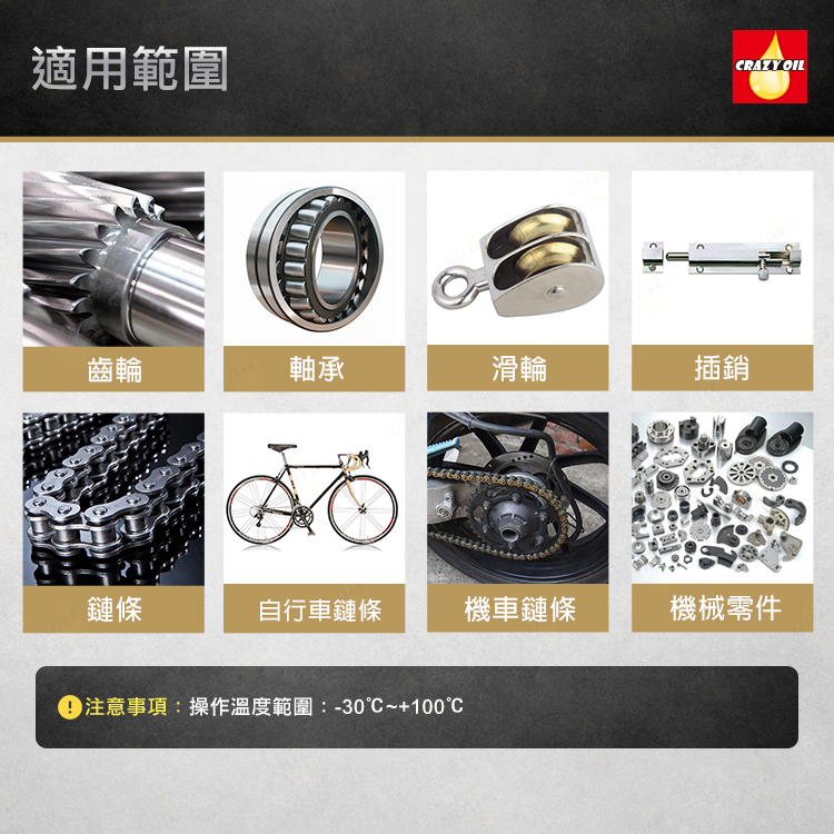 應用範圍:適用於快速轉動零件,如:機車、腳踏車、工具機等鍊條使用。