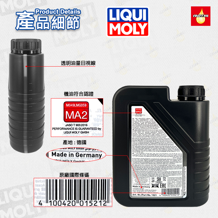 在德國當地市場,LIQUI MOLY 擁有約 30% 潤滑油市佔率與全國第一的添加劑銷量,每年銷出超過 700 萬瓶。多次獲得德國汽車雜誌《AUTO MOTOR UND SPORT》與《AUTO ZEITUNG》最佳品牌獎,是德國消費者心中最具信賴的機油品牌。