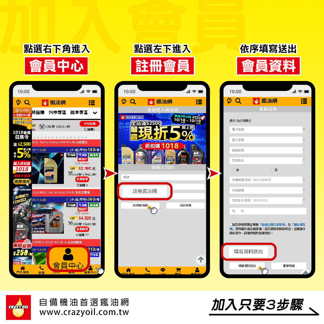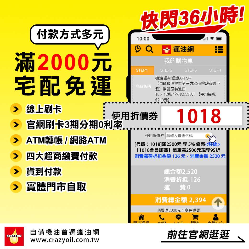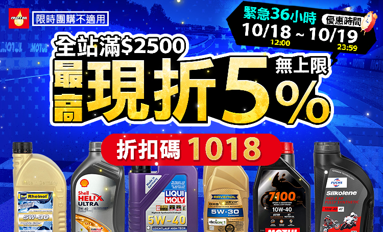 至瘋油網官網購買機油,全站滿2,500 元,現折 5% 。