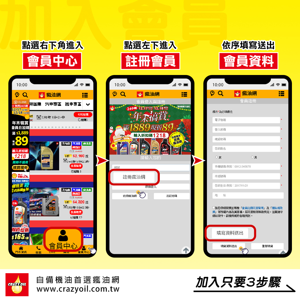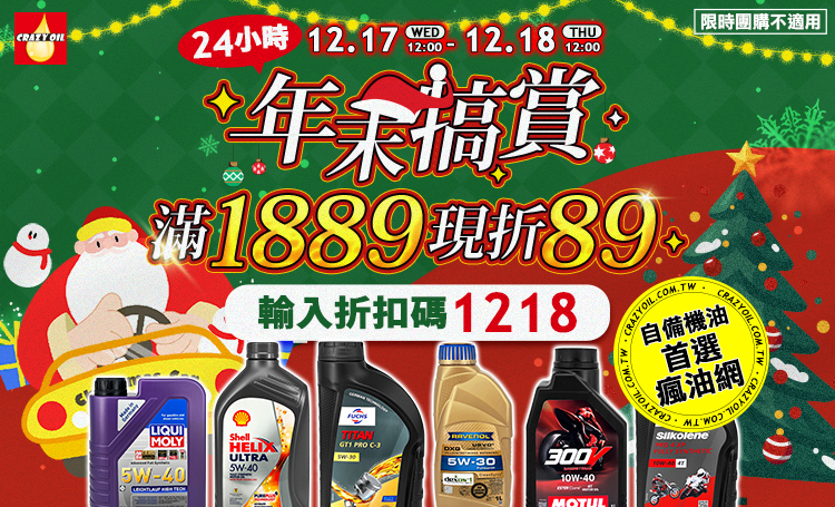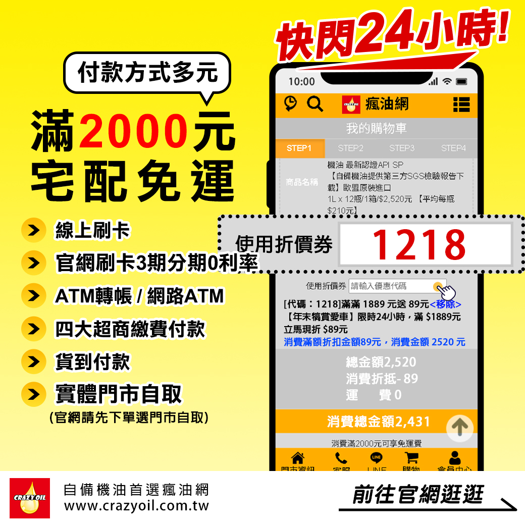 至瘋油網官網購買機油,全站滿 $1889 折 $89。