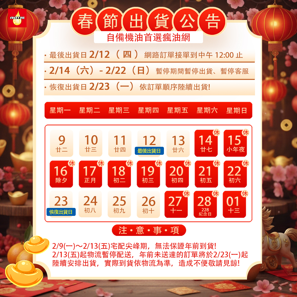 若您有保養或其他須儘早收到商品的需求,建議提早下單 或至 門市 購買,2/13(五)起 物流暫停配送。
