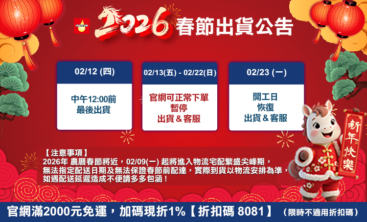 因物流配送繁忙,2/2(一)至2/13(五)起,無法保證年前到貨